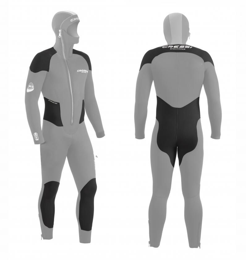 • Paneles de forro elástico reforzado Small Dyamond© de gran resistencia en nalgas, cintura y hombros. La zona reforzada de los hombros se prolonga hacia los brazos para reducir el habitual deterioro en uso Diving Center de la zona de los hombros por la acción combinada de la percha, el sol y el propio peso del traje que se concentra en este punto