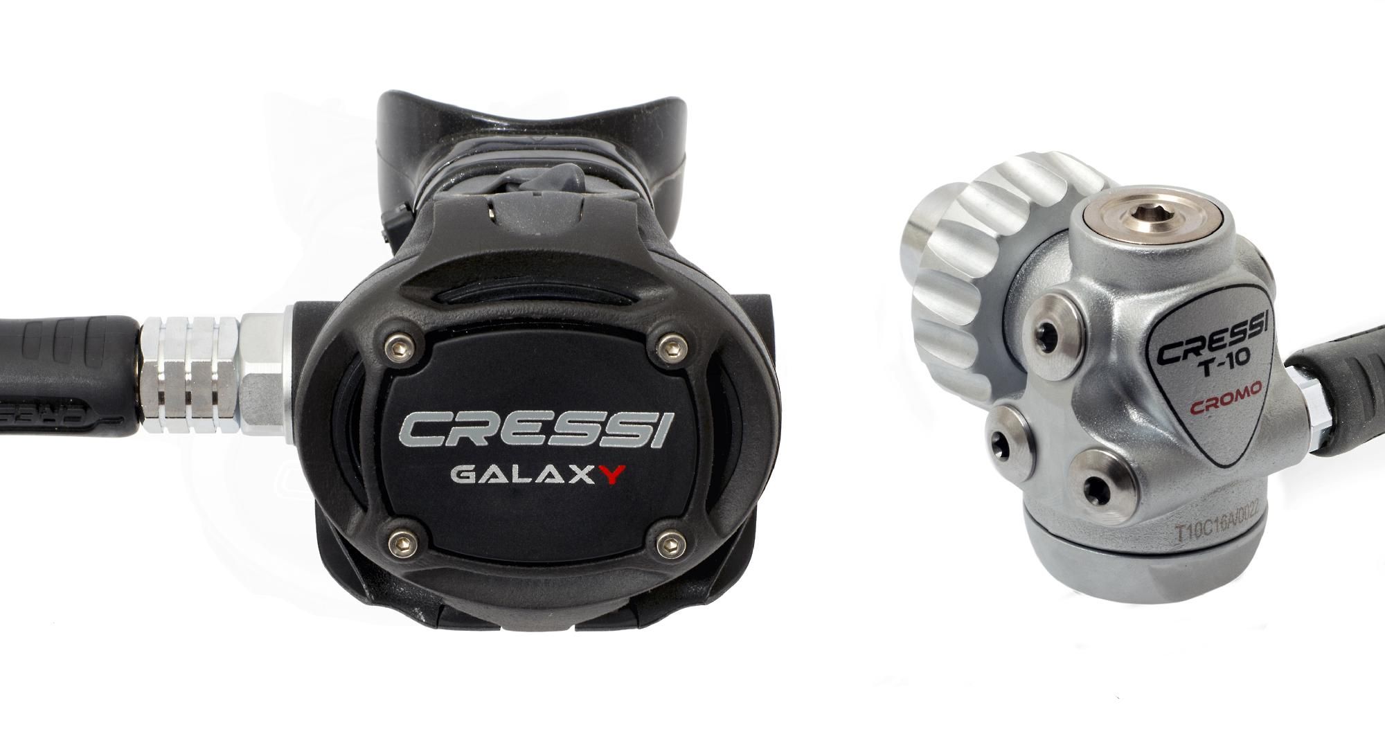 La configuración en T permite una mayor integración de la primera etapa en el perfil de la grifería y, por tanto, mayor libertad de movimiento de la cabeza del buceador. El mecanismo funciona transversalmente a la entrada de aire y la posible filtración de partículas procedentes de la botella que consigan sobrepasar el filtro no incide directamente en la válvula.